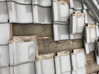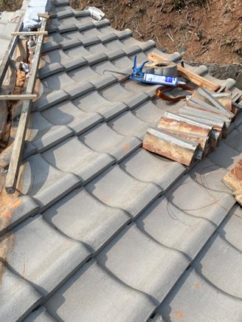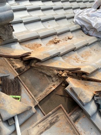 施工中の写真です!隅棟を解体すると、やはり雨の入った形跡が見つかりました。隅棟の下に敷く瓦は特定の形にカットするのですが、その形状に問題があったようです。