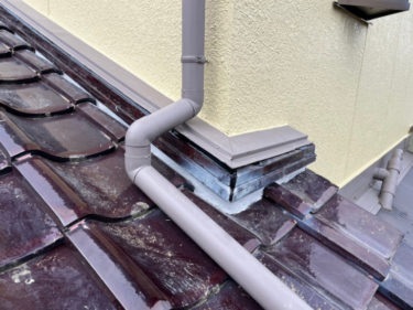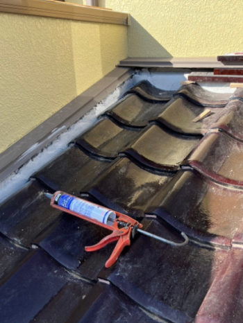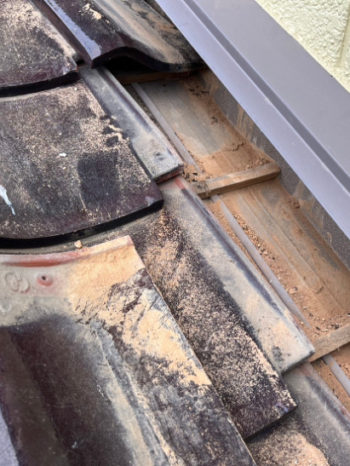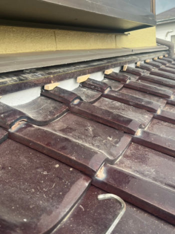 捨て板金の上に瓦桟木がのっています。板金を通る水をせき止め雨漏りの原因になるのでカットします。