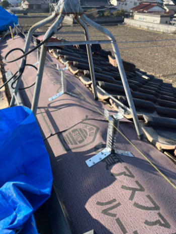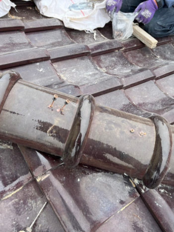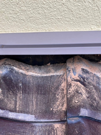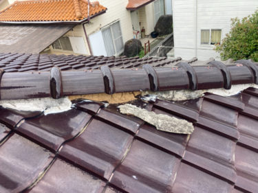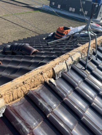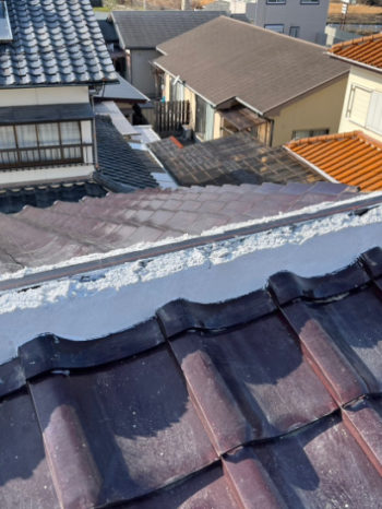 | ご提案内容 | 棟の漆喰のはがれと壁のし瓦のずれが見られました。施工に土が使用されていることもあり漆喰塗りなどのその場しのぎの工事では10年もたず崩れてくると予想ができましたので、棟、壁のし瓦を一度撤去して施工をし直す工事を提案させていただきました。工法も棟金具や人工木を使った耐震、耐風に優れた新しい施工法を採用することで、より長く安心して住んでいただけるようになると思います。 |