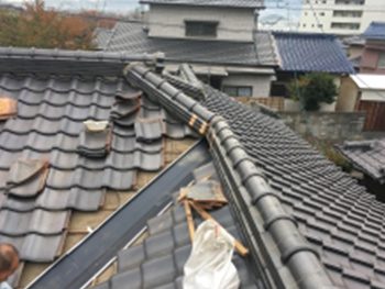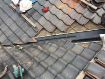瓦屋根の修理のスタートです。まずは、本谷板金を取り替えるために瓦を取り除きます。