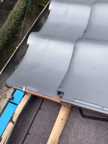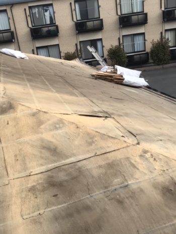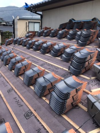 板の上に、新しくルーフィング(防水紙)をはっていきます。さらにその上から桟木を施工していき、あとは瓦を葺いていくのみとなりました!!!