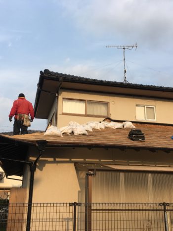 施工中の写真です!今回は全面の葺き替え工事を行うため、古い瓦をすべて取り除きます。