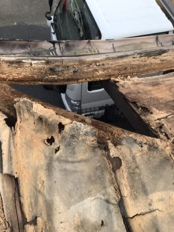 特に雨漏りの被害が大きかった部分は、防水紙よりしたの木材も損傷していました。軒天の腐食はこの部分ですね。