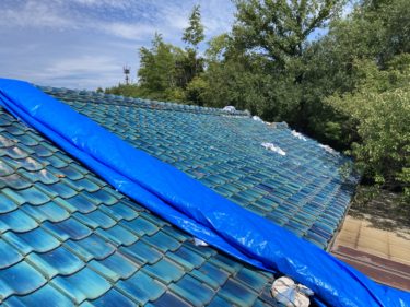 施工前、診断時の様子です。いたるところから雨漏りが発生したため、家主さんがシートと養生テープで屋根を覆っている状態でした。