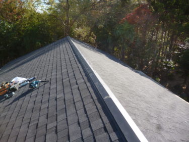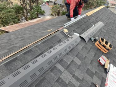 棟施工の仕上げとして、ガルバリュウム鋼板の板金を使用しました。天井裏の換気ができるよう、換気棟板金も取り付けます。