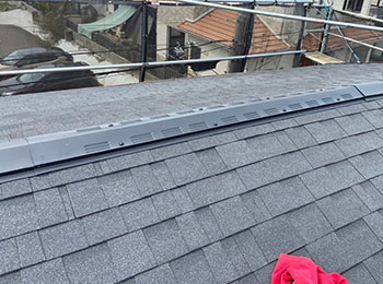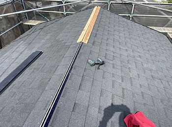 仕上げに棟板金、小屋裏換気の為の換気棟も取付ます