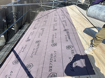 新しい野地板の上に防水紙(ゴムアス)を張ります。