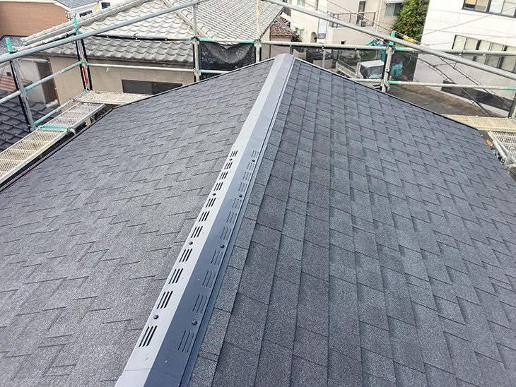 アスファルトシングルを取付ます。釘とシングルセメントをしっかり使って取付ます。