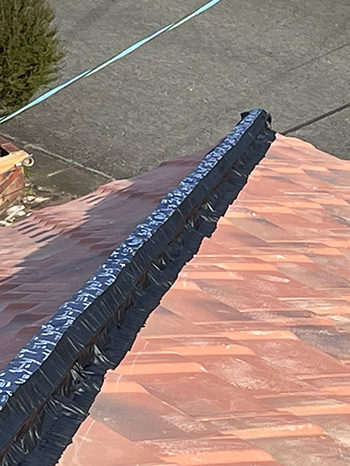 10棟瓦を取り付ける前に乾式棟面戸でおおいます。アルミとブチルゴムでできた素材で軽くて強いものです