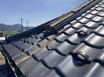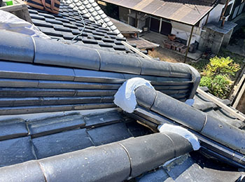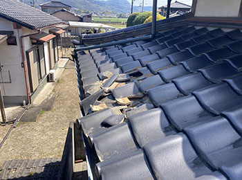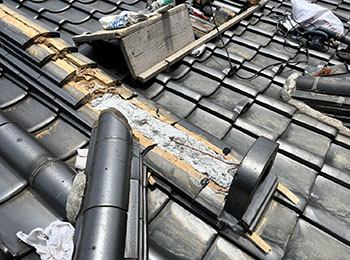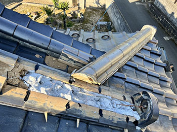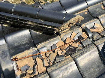 現地調査に行くと、崩れた瓦が落ちてきて下の屋根瓦も割れています。