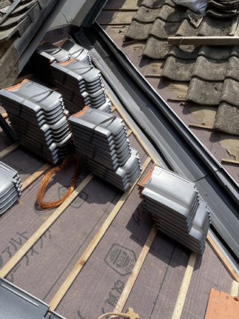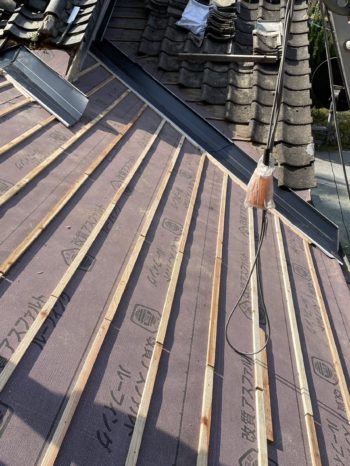 4瓦を上げて葺きます。境目の谷板金も新しくします。