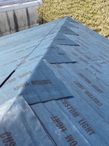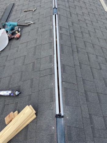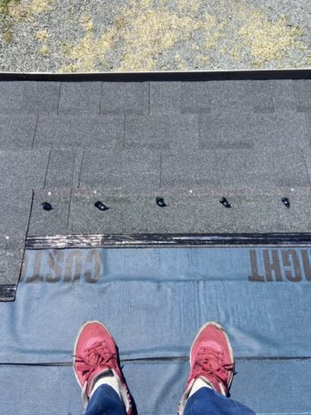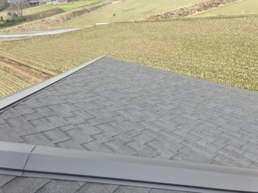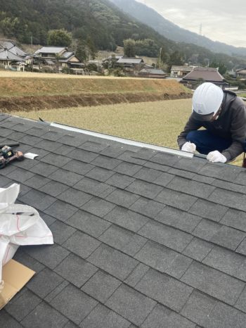 周囲の板金を取付けたら屋根材のアスファルトシングル(アルマ)を取付けます。しっかり釘と接着材を併用して取付けていきます。